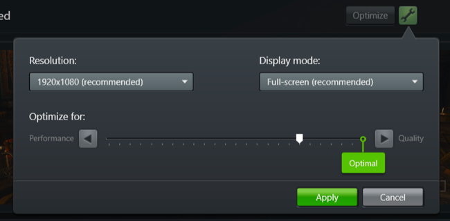 Para ajustar esto en NVIDIA GeForce Experience, haga clic en el icono de engranaje junto al botón Optimizar. Obtendrá opciones para cambiar la resolución y el modo de visualización, pero lo más importante, obtendrá un control deslizante que le permite sopesar su configuración para el rendimiento o la calidad.