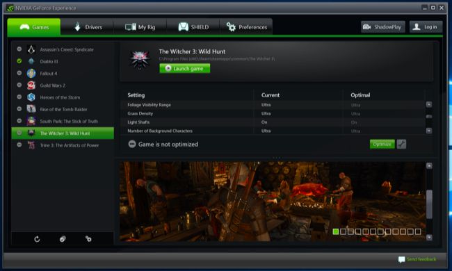 Ahora, lo bueno: para optimizar un juego, simplemente selecciónelo de la lista y haga clic en el gran botón «Optimizar». En la herramienta Intel, simplemente haga clic en el icono del juego y luego haga clic en «Optimizar». (Si no ha iniciado el juego antes, es posible que deba iniciarlo una vez antes de que el botón funcione correctamente).