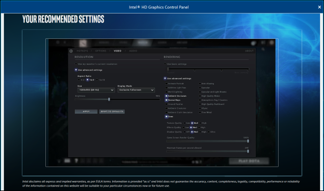 La herramienta de Intel no le permite modificar la configuración desde la aplicación más allá de habilitar o deshabilitar la configuración recomendada. Para ver la configuración recomendada, haga clic en el icono de un juego y seleccione «Ver configuración». A continuación, puede ver la configuración recomendada por Intel.