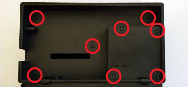 Para comenzar, retire la base de su Switch de su lugar normal junto al televisor y desenchufe todo el hardware. Levante la tapa en la parte posterior para revelar los puertos de conexión. Retire estos ocho tornillos con su destornillador de tres alas: