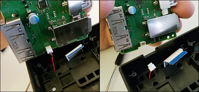 Don’t worry about the LED light in the original dock: it’s just an indicator and won’t be part of your finished modified dock. With the USB ribbon cable reattached, take the USB-C port on the end of the ribbon cable and insert it into the oval hole in the top shell piece.
