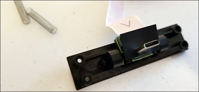 Hay dos tornillos muy, muy pequeños que sujetan el puerto USB-C en su lugar en el ensamblaje deslizante. Querrá el destornillador más pequeño que tenga que aún incluya un buen agarre para este paso. Retire esos tornillos, déjelos a un lado y luego extraiga el puerto USB-C.