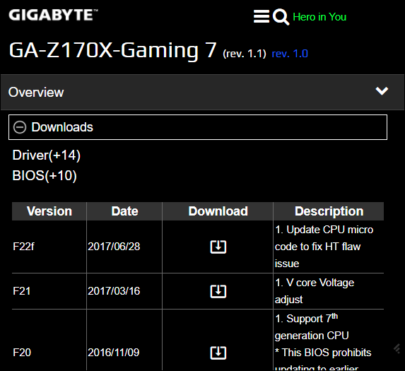 Primero, diríjase al sitio web del fabricante de la placa base y busque la página Descargas o Soporte para su modelo específico de placa base . Debería ver una lista de las versiones de BIOS disponibles, junto con los cambios / correcciones de errores en cada una y las fechas de su lanzamiento. Descargue la versión a la que desea actualizar. Probablemente desee obtener la versión más reciente de BIOS, a menos que tenga una necesidad específica de una anterior.