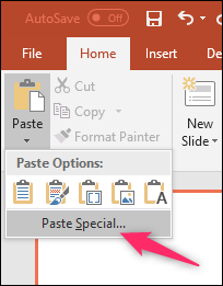 Ahora, cambie a su presentación de PowerPoint y haga clic para colocar el punto de inserción donde le gustaría que vaya el material vinculado o incrustado. En la pestaña Inicio de la cinta, haga clic en la flecha hacia abajo debajo del botón «Pegar», y luego elija el comando «Pegado especial» del menú desplegable.