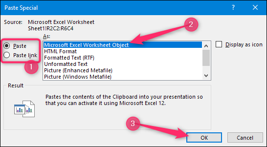 Esto abre la ventana Pegado especial. Y es aquí donde encontrará la única diferencia funcional en los procesos de vinculación o incrustación de un archivo.