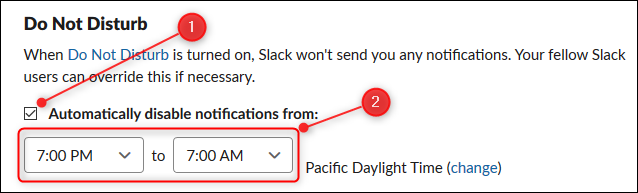 Desplácese hacia abajo hasta la sección «No molestar». Asegúrese de que la casilla de verificación «Deshabilitar automáticamente notificaciones de» esté seleccionada. Haga clic en cada flecha desplegable y seleccione la hora de inicio y finalización de su período preferido de «No molestar».