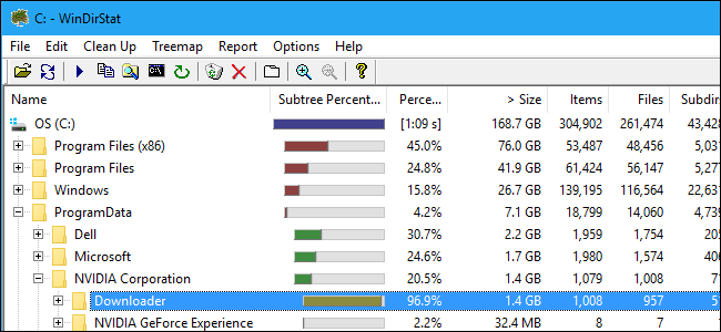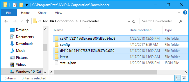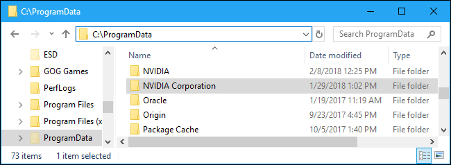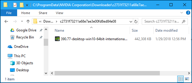 Por el momento, NVIDIA almacena estos archivos de instalación del controlador de gráficos en C: \ ProgramData \ NVIDIA Corporation \ Downloader. El directorio ProgramData está oculto de forma predeterminada, por lo que debe ver los archivos ocultos o escribir C:\ProgramDataen la barra de ubicación del administrador de archivos para ir allí.
