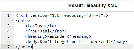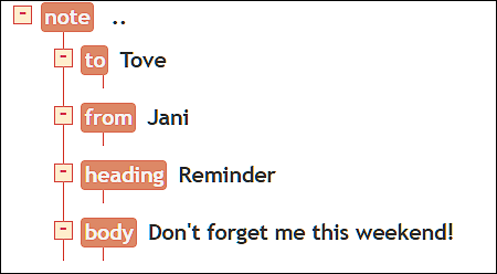 El botón «Vista de árbol» muestra sus datos en una estructura de árbol con un formato agradable en el panel de resultados, con todas sus etiquetas a la izquierda en naranja y los atributos a la derecha de las etiquetas.