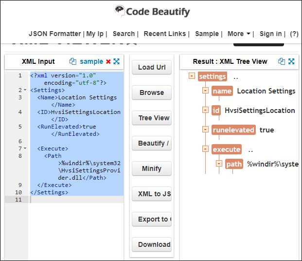 Para el ejemplo aquí, usaremos CodeBeautify.org. La página está dividida en tres secciones. A la izquierda está el archivo XML con el que está trabajando. En el medio, encontrarás varias opciones. A la derecha, verá los resultados de algunas de las opciones que puede seleccionar. Por ejemplo, en la imagen de abajo, nuestro archivo XML completo está a la izquierda y la vista de árbol se muestra en el panel de resultados porque hicimos clic en el botón «Vista de árbol» en el medio.